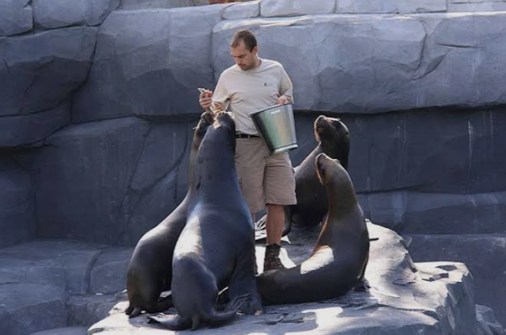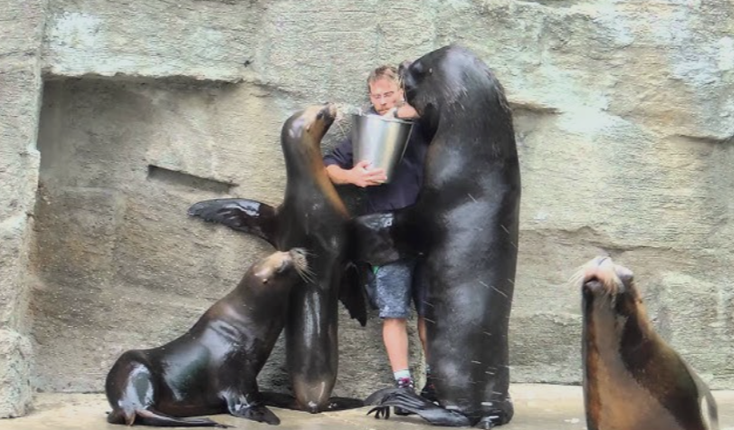 In the image, a marine animal caretaker stands near a rocky enclosure while holding a bucket typically used for feeding fish. Around him, several sea lions gather, clearly excited during what appears to be feeding or training time.