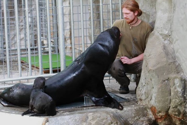 Through regular interaction, training sessions, and feeding routines, animals can become comfortable around their caretakers and may even show signs of affection or excitement when they see them. The sea lion in this moment appears to be expressing that comfort in a very visible way. Standing upright and leaning against the caretaker requires trust, as the animal is placing its large weight close to the human without any signs of aggression.