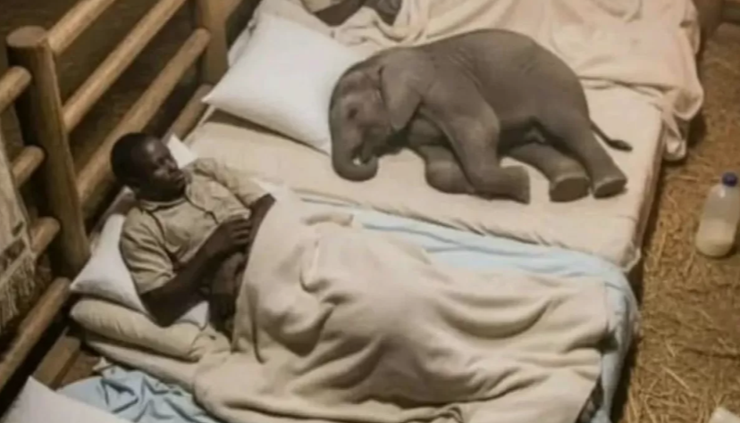 Instead of quiet empty rooms, the space is shared between dedicated caretakers and the smallest residents — orphaned baby elephants who depend entirely on human care to survive. In the image, two caretakers rest on simple beds inside a wooden enclosure lit softly by lantern light. Nearby, two baby elephants sleep peacefully beside them, curled up like oversized puppies on the bedding.
