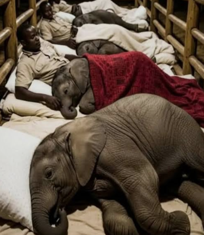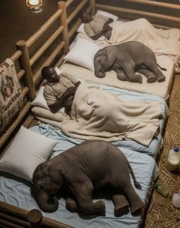 Instead of quiet empty rooms, the space is shared between dedicated caretakers and the smallest residents — orphaned baby elephants who depend entirely on human care to survive. In the image, two caretakers rest on simple beds inside a wooden enclosure lit softly by lantern light. Nearby, two baby elephants sleep peacefully beside them, curled up like oversized puppies on the bedding.