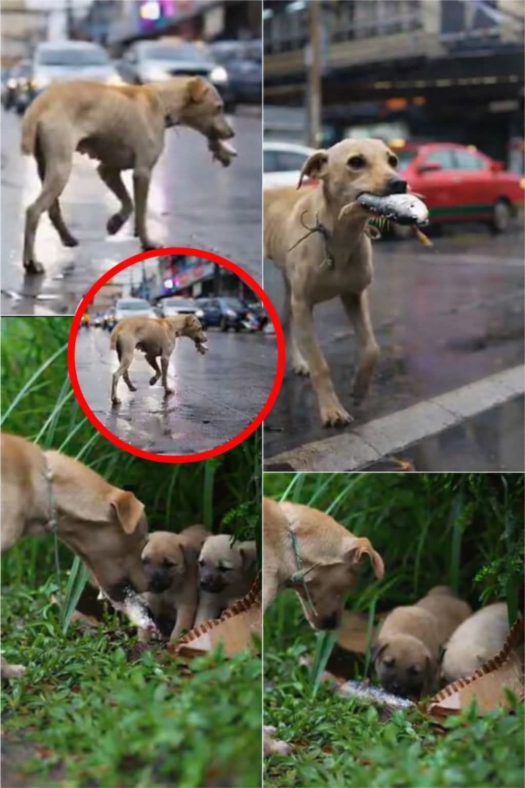 Through busy streets and rushing cars, a thin stray mother dog walked carefully across the road with a small fish in her mouth. 🚗🌧️
