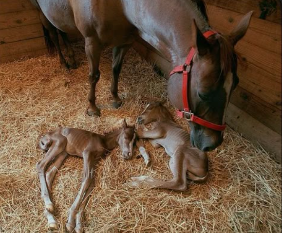 Inside a quiet wooden stable, a powerful yet heartbreaking scene unfolds on a bed of golden straw. A mare stands protectively over two newborn foals lying beside her. Their small bodies rest close together, their delicate legs folded beneath them.