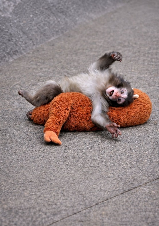 Maybe Punch simply finds warmth and comfort in something soft to hold.