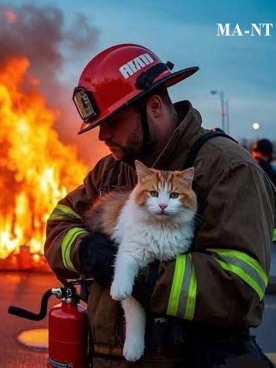 In a striking moment of bravery, a firefighter is captured holding a cat safely away from a fierce blaze. Behind them, flames roar, illustrating the dangerous conditions faced by first responders. Despite the chaos, the firefighter remains calm and focused, prioritizing the cat’s safety and demonstrating extraordinary courage.