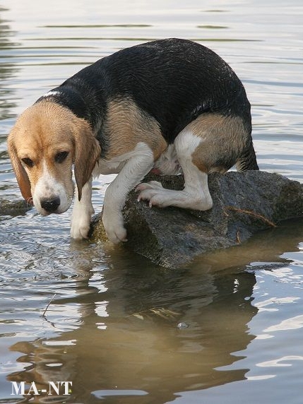 Animals often face situations that challenge their confidence and safety. This image captures a Beagle perched nervously on a rock in the middle of a shallow body of water, unsure of what to do next. The dog’s cautious posture reflects the instinctive hesitation animals experience when confronted with unfamiliar or potentially risky situations.