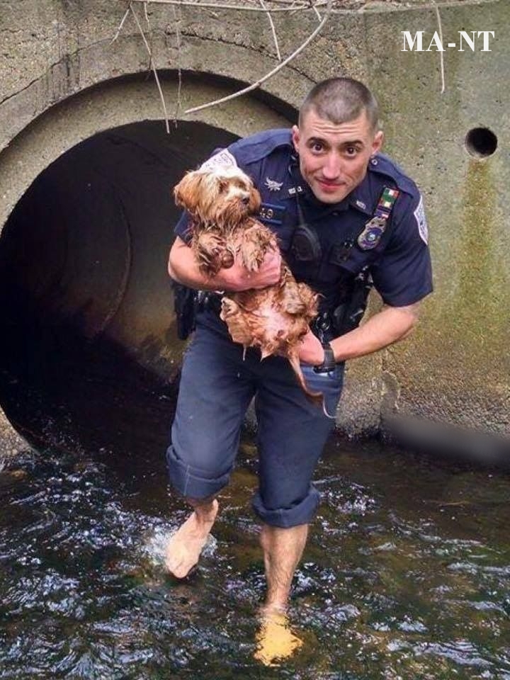 The dog, soaked and likely terrified, clings to safety in the arms of the officer. While small in size, the dog’s vulnerability is immense, emphasizing how critical timely intervention is in these situations. The officer’s careful and reassuring handling demonstrates the patience and empathy needed to protect animals from dangerous circumstances.