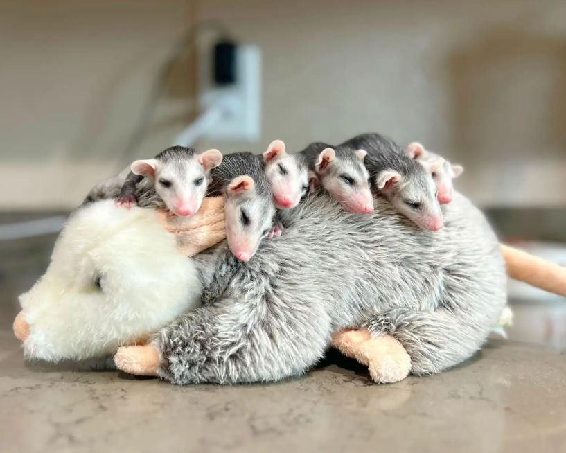 🦝 Five Baby Opossums Turn a Plush Toy Into the Cutest Wildlife Snuggle Spot