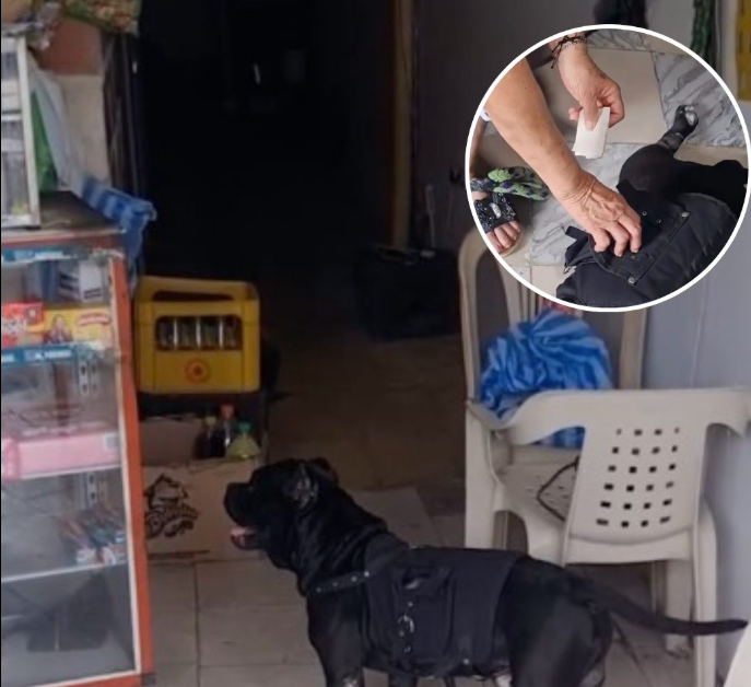 One striking example is a black dog seen patiently standing inside a small shop entrance, wearing a special harness equipped with pockets. At first glance, the vest might look like a simple accessory. But it serves a much more important purpose.