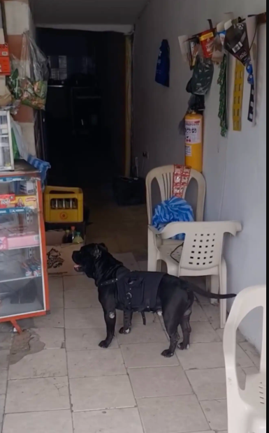 One striking example is a black dog seen patiently standing inside a small shop entrance, wearing a special harness equipped with pockets. At first glance, the vest might look like a simple accessory. But it serves a much more important purpose.
