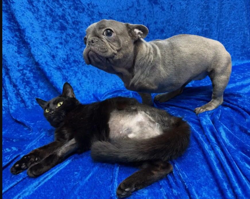 Lying comfortably but still alert, the cat appears to be taking things slowly as it heals. Standing nearby is an unlikely guardian — a French Bulldog who seems determined not to leave its feline companion alone.