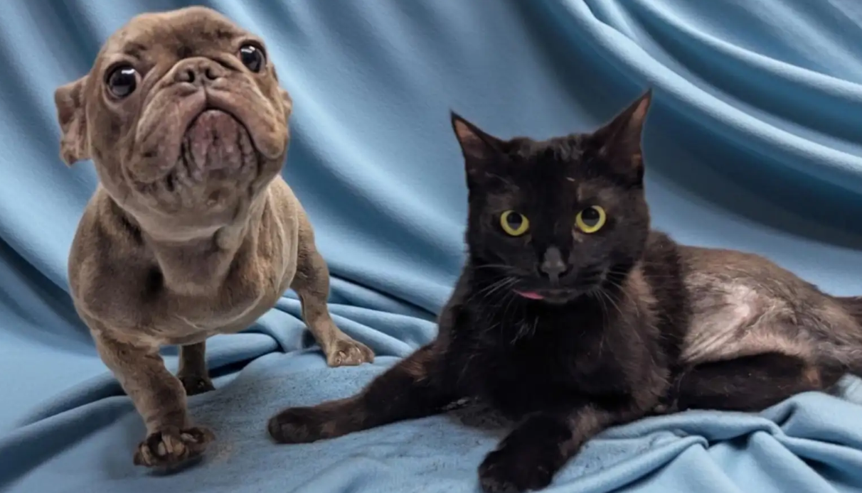 Lying comfortably but still alert, the cat appears to be taking things slowly as it heals. Standing nearby is an unlikely guardian — a French Bulldog who seems determined not to leave its feline companion alone.