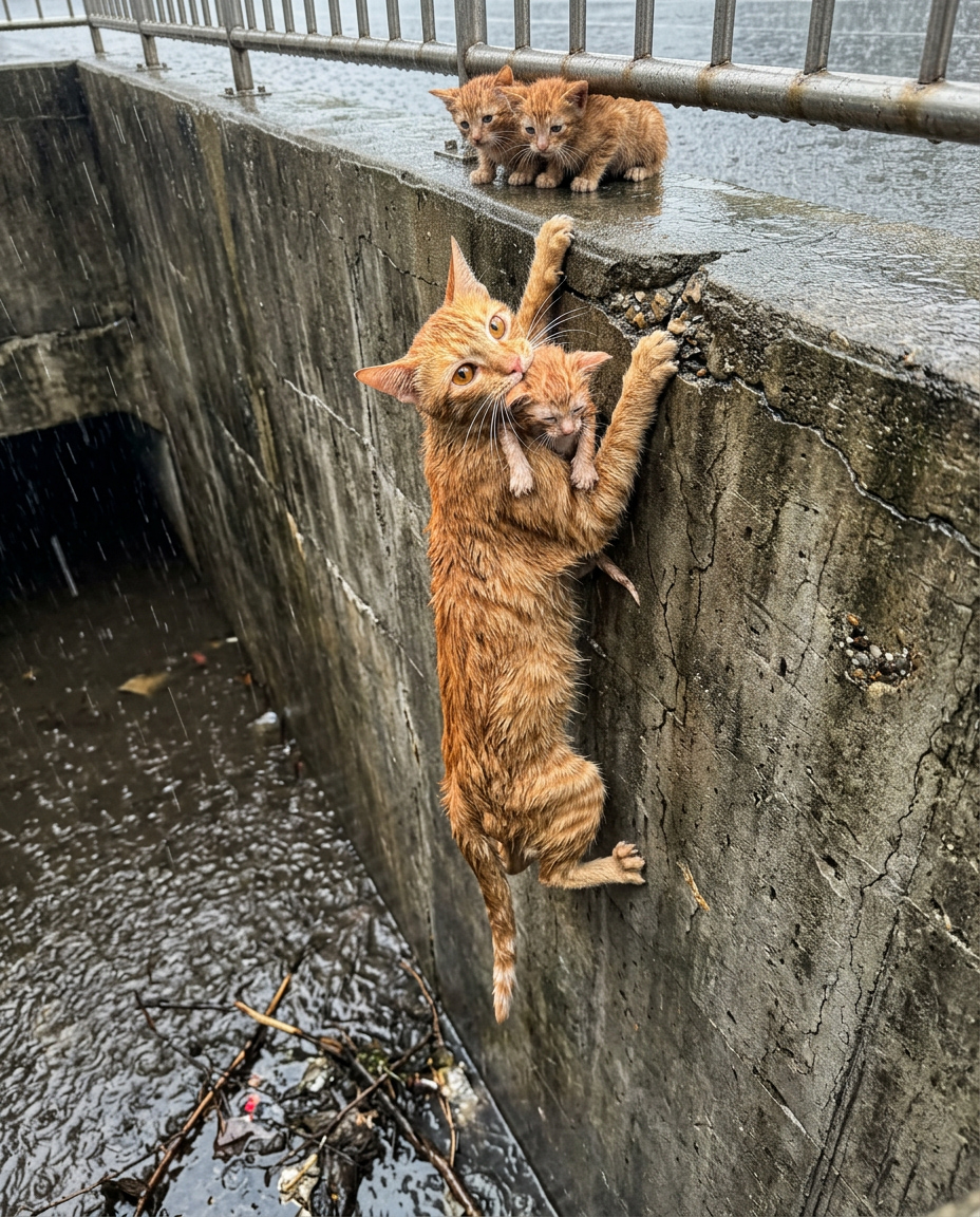 Above her, two little kittens waited nervously, watching their brave mother struggle to climb up to safety.Không có mô tả ảnh.