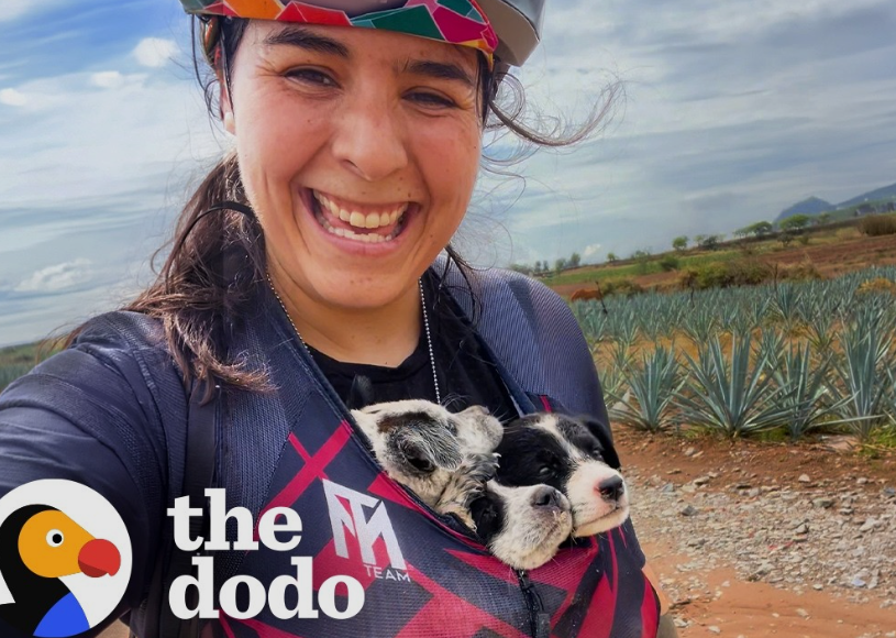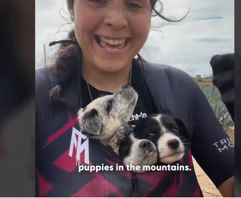 Thinking quickly, she placed the puppies inside her cycling jersey and pockets, holding them close to her body for warmth and protection. The tiny heads peeking out from the front of her jersey made for an unusual but heartwarming sight.