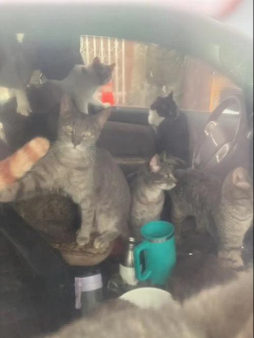 How did so many cats end up inside one car? For a moment, it almost looked like the vehicle had been completely taken over by a feline crew.