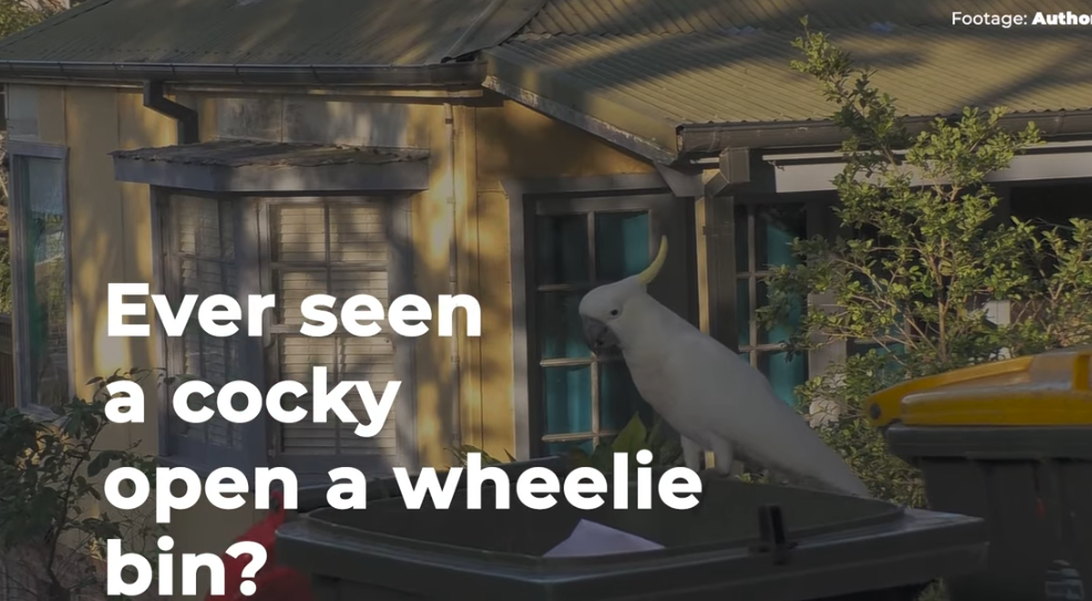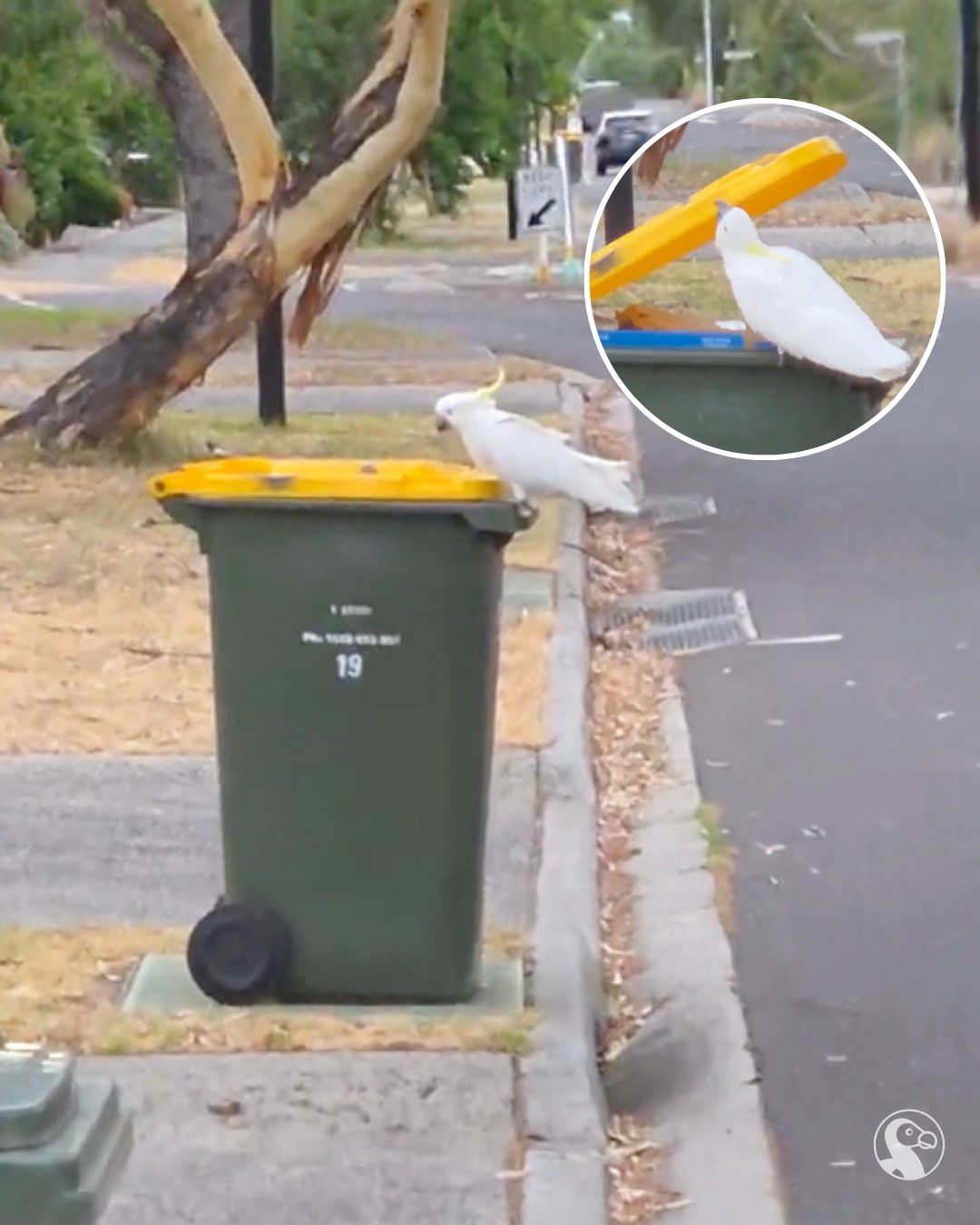 On an ordinary suburban street, an extraordinary moment unfolded. A white cockatoo—most likely a sulfur-crested cockatoo—was spotted perched on the edge of a roadside garbage bin, demonstrating a level of intelligence that surprised many people who later saw the photo.