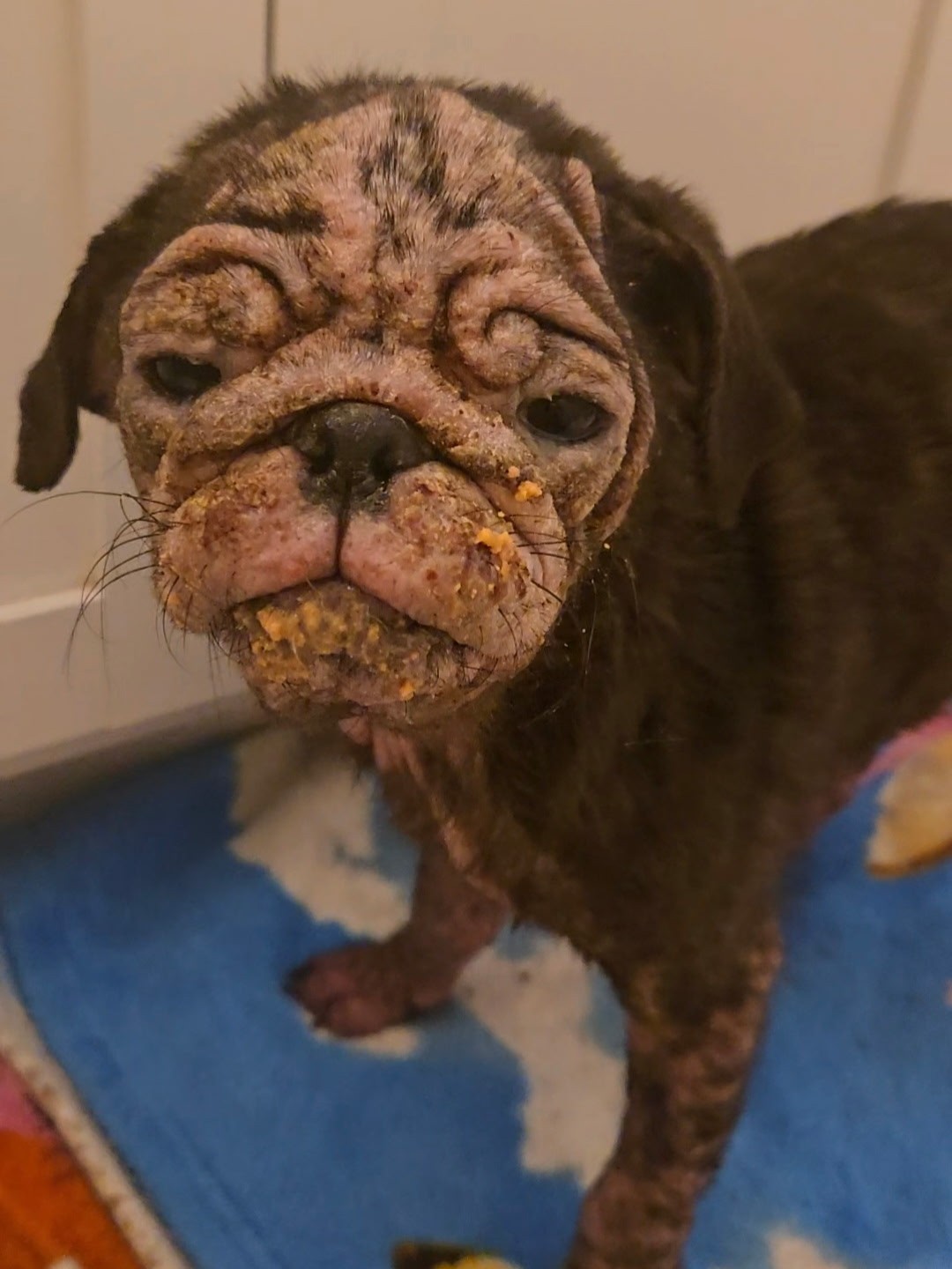 Somewhere between relaxing on the couch and appearing in the muddy photo, this curious little pug clearly had an adventure.