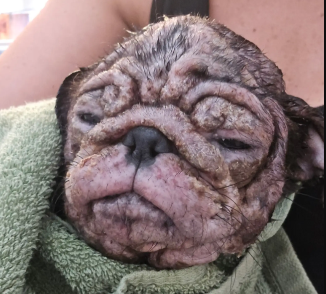 At first glance, the image looks shocking. A small pug stares into the camera with a face completely covered in mud and dirt. Its fur is dark, wet, and clumped together, and its iconic wrinkles appear even deeper under the layer of grime. The poor dog looks almost unrecognizable.