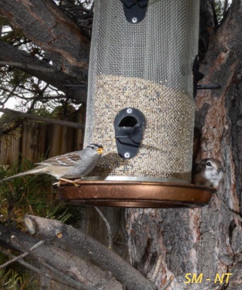 In a quiet backyard, a simple bird feeder hanging from a tree has become the stage for a small but amusing moment in nature. The image captures two small birds—likely sparrows—interacting with a feeder filled with seeds. At first glance, it appears to be a normal feeding scene. But a closer look reveals something much more entertaining.