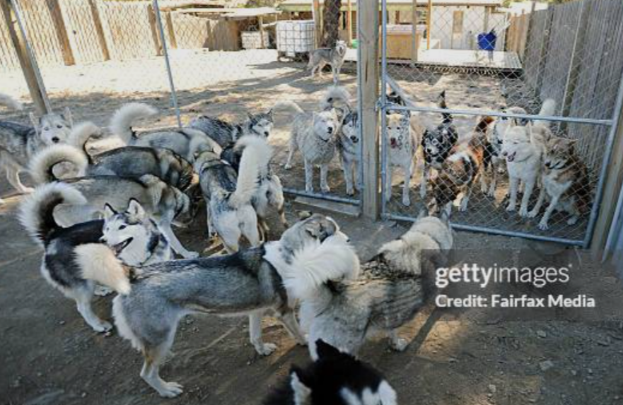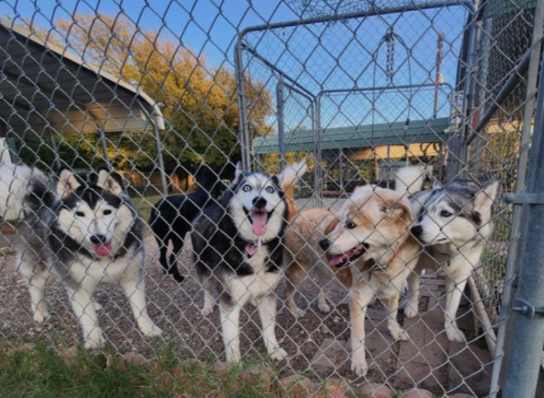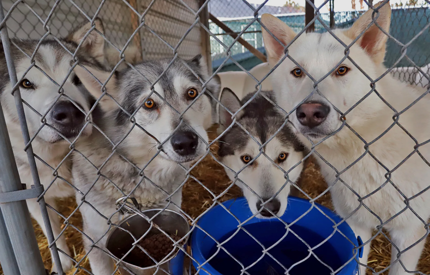 The image capturing this moment shows a large group of dogs gathered behind a fenced shelter enclosure. Many of the animals resemble huskies and other northern breeds, standing close together and looking out through the gate. Their curious expressions and energetic posture suggest they are eager for attention and interaction—something many shelter animals crave.