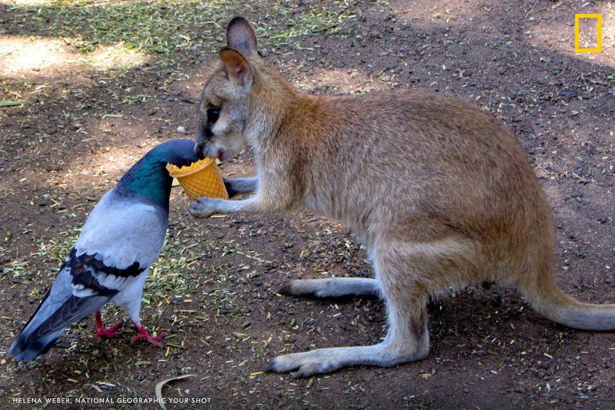 Nature often surprises us with moments that look almost like scenes from a storybook. In this unusual encounter, a kangaroo and a pigeon appear to share an ice-cream cone together. 🍦