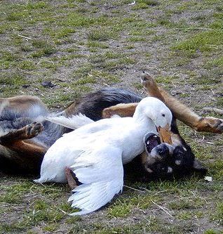 In the image, a goose appears to be interacting intensely with a dog lying on the grass. At first glance, the scene may look aggressive or chaotic, but it may actually reflect a form of instinctive response.