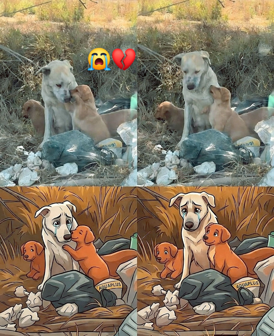 In a quiet patch of dry grass surrounded by scattered trash, a heartbreaking scene unfolds between a stray mother dog and her two small puppies. 🐶💔