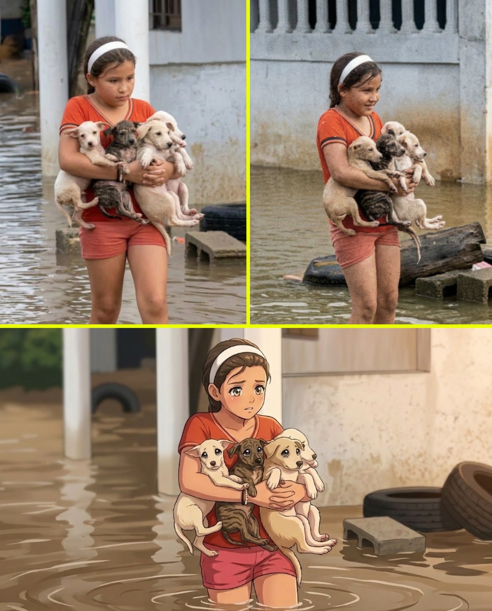 Witnesses who saw the moment said it was both simple and deeply touching. The girl didn’t hesitate, didn’t complain, and didn’t think twice about carrying the puppies through the flooded street.