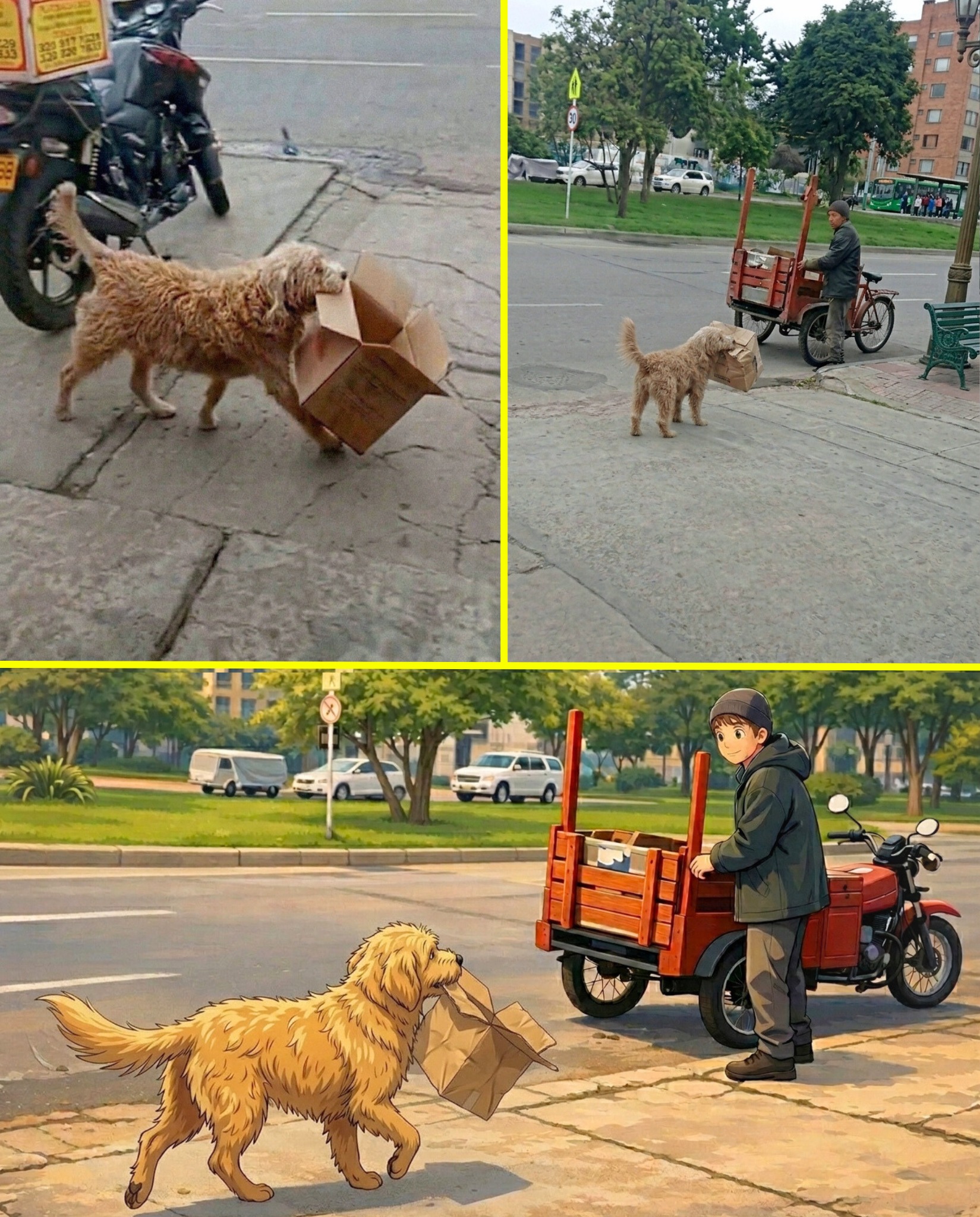Whenever they find a box on the street, the little dog runs over, gently grabs it with his mouth, and proudly carries it back to the tricycle where his owner stacks the recycling.