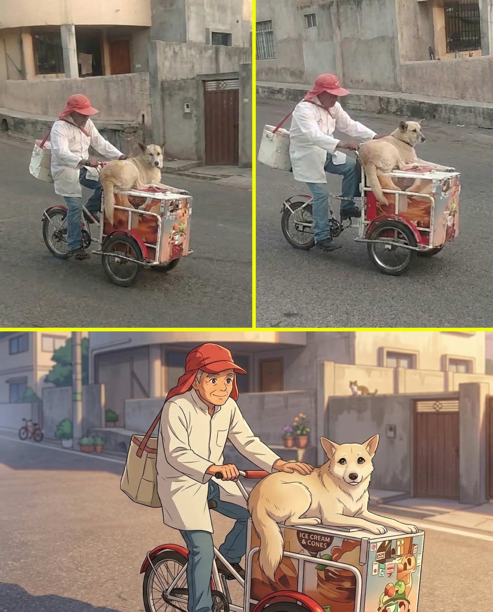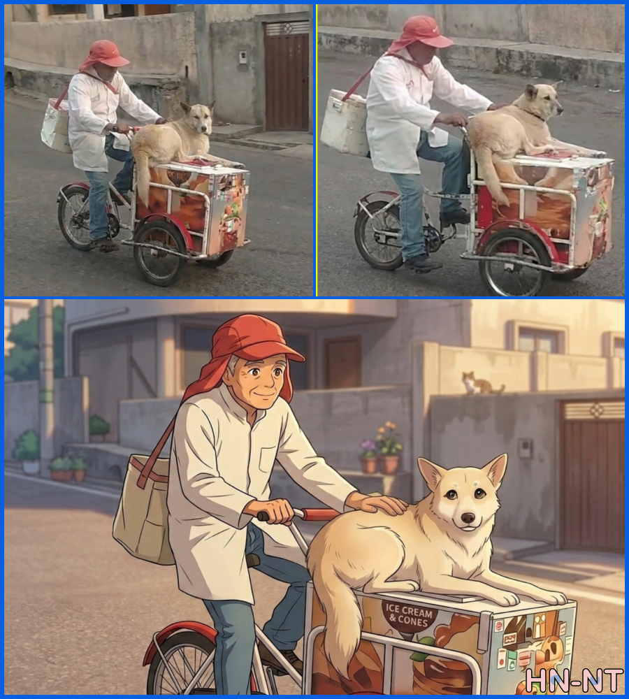 Comfortably perched on the tricycle, the pup rides along as the man pedals through the streets. Whether the day is hot or cold, the tiny passenger is always there, calmly looking around and enjoying the ride beside the person he trusts the most.