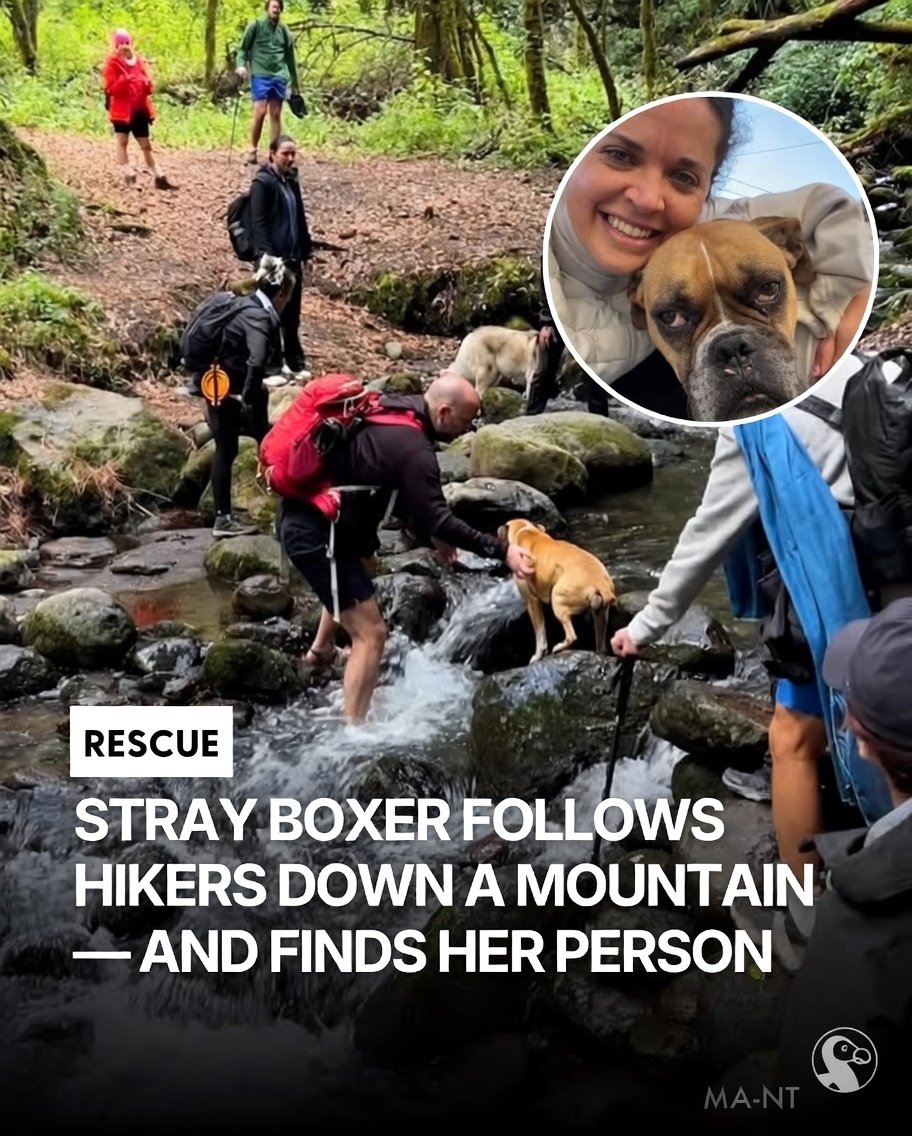 On a mountain trail, a weak and sick stray boxer began following a group of hikers. Alone and vulnerable, she seemed determined to stay with them. Among the hikers was a woman who made a quiet promise to herself: if this dog followed them all the way to the bottom, she would take her home.