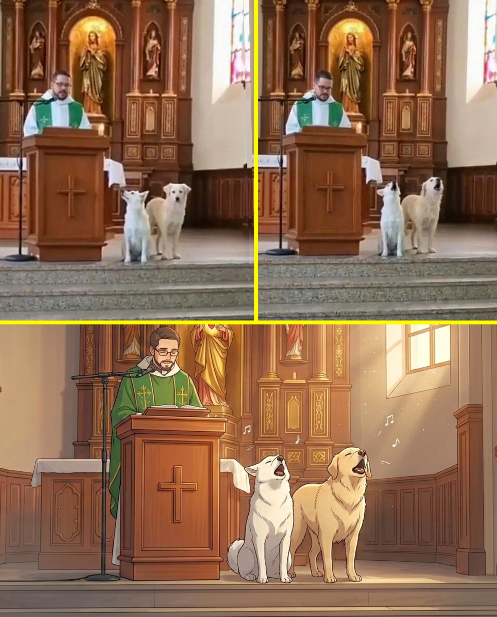 During a quiet mass, the priest was giving his message when two small dogs — adopted by the parish — settled themselves right in front of the altar. 🐾