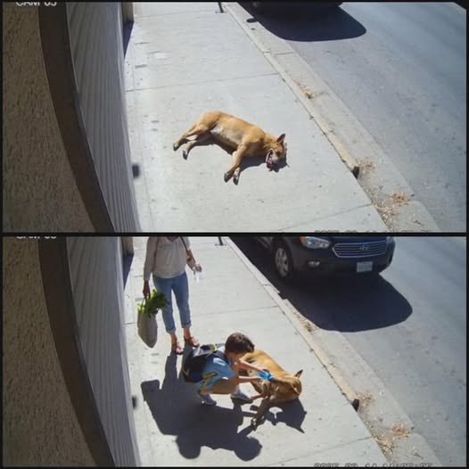 The boy didn’t try to pull the dog up or force it to move. Instead, he gently guided the animal toward a nearby patch of shade and stayed beside it, speaking softly and keeping it company until adults arrived to take over and get the dog proper care.