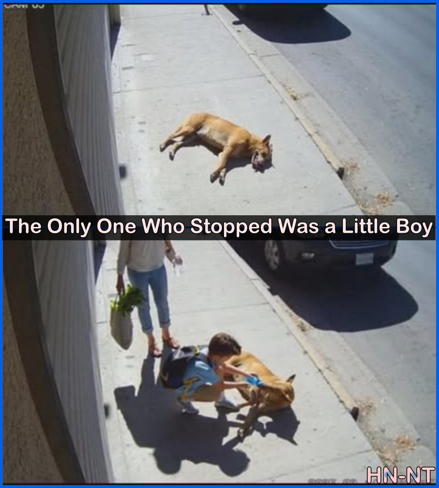 Walking with his mother, the child suddenly pulled toward the dog, clearly worried. While his mother quickly began calling for help, the boy crouched beside the exhausted animal.