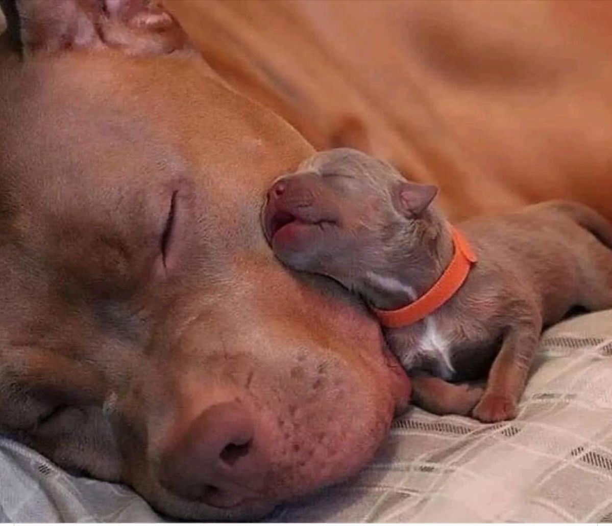 Tucked gently against the large, warm cheek of its mother, a tiny puppy drifts into peaceful sleep. 💤