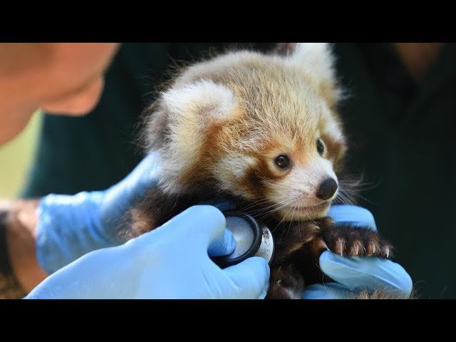 In a quiet moment of care and precision, a wildlife veterinarian gently holds a baby red panda while listening to its tiny heartbeat with a stethoscope. The small animal sits calmly in gloved hands, its fluffy tail curled beneath it and its curious eyes looking out into the world. Though the moment may appear simple, it represents something far greater — the ongoing effort to protect one of the world’s most vulnerable species.