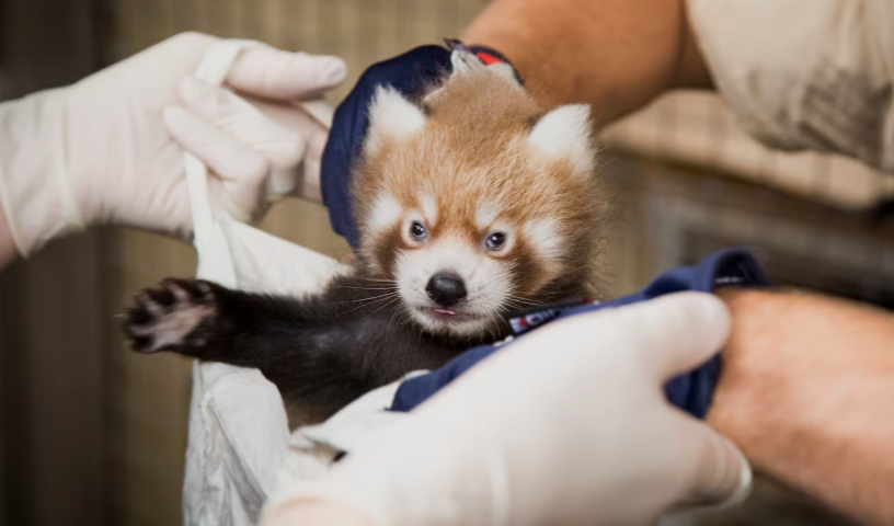 In a quiet moment of care and precision, a wildlife veterinarian gently holds a baby red panda while listening to its tiny heartbeat with a stethoscope. The small animal sits calmly in gloved hands, its fluffy tail curled beneath it and its curious eyes looking out into the world. Though the moment may appear simple, it represents something far greater — the ongoing effort to protect one of the world’s most vulnerable species.