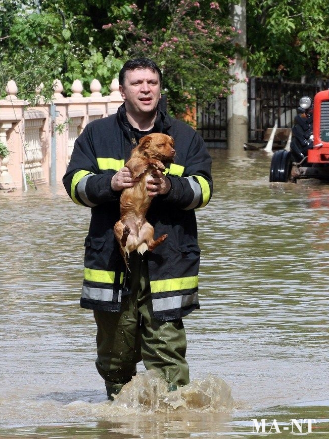 Natural disasters put countless lives at risk, including our animal companions. This striking photo captures a rescuer carrying a small dog through rising floodwaters, a testament to the courage, dedication, and compassion of those who respond to emergencies. Behind them, others navigate a tractor through the water, showing the collective effort involved in saving both humans and animals during crises.