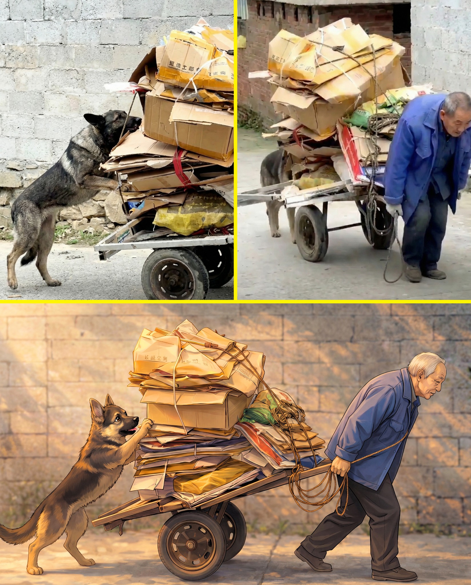 He walked beside the cart and began pushing it with all his strength, as if he understood that his best friend needed help. 🐾