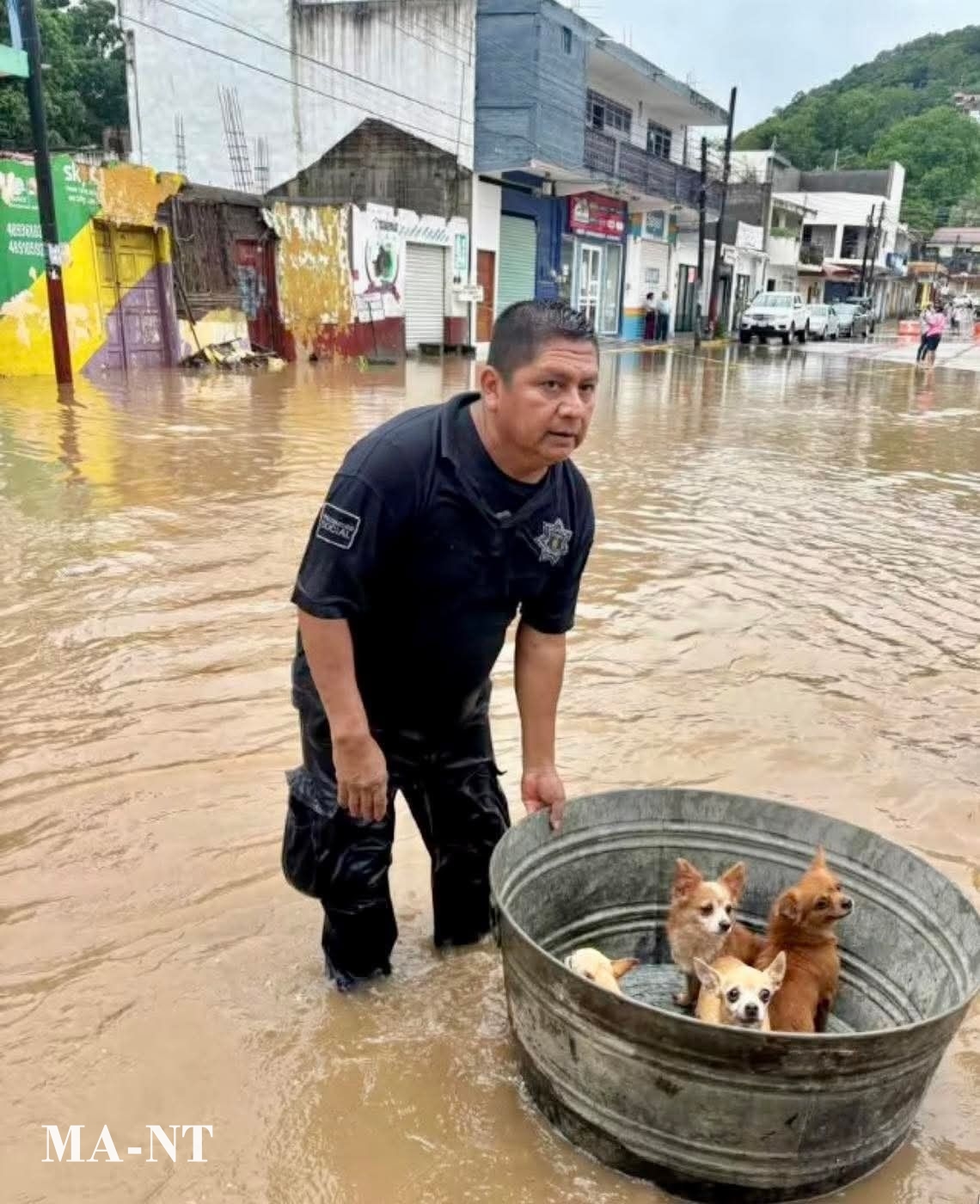 A rescuer was seen wading through muddy floodwater while guiding a large metal tub carrying four small dogs to safety. The image is both simple and unforgettable. The dogs, pressed closely together inside the makeshift boat, appear frightened but calm, trusting the person leading them through the dangerous water.