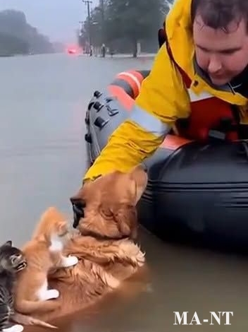 In a powerful moment of compassion, a flood rescue scene is drawing attention for its raw emotion and unforgettable image: a drenched dog struggling in deep water while two tiny kittens cling close, as a rescuer reaches down from an inflatable boat.