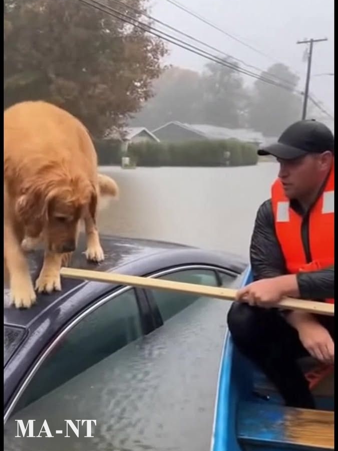 In a heartbreaking but hopeful flood scene, a golden retriever was spotted stranded on the roof of a partially submerged car as high water swallowed a neighborhood street. With homes and vehicles surrounded by floodwater, the dog appeared frightened, soaked, and unsure where to step next.