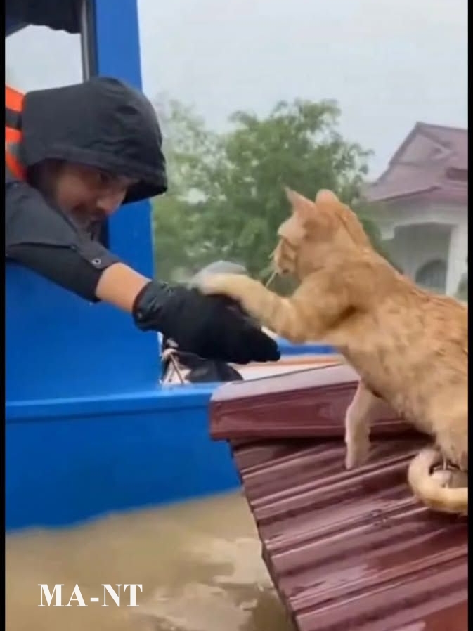 Perched on the edge of a wet rooftop above muddy floodwater, an orange cat appears frightened but alert, trapped by the rising water surrounding the home. Just inches away, a rescuer leans from a blue boat, extending a gloved hand. Then comes the moment that makes the scene unforgettable: the cat reaches out with its paw.