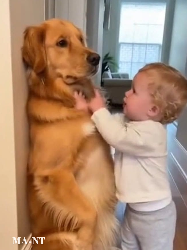 In this heartwarming scene, a golden retriever stands calmly against the wall while a toddler reaches up with both hands, seemingly petting or hugging the dog’s chest and neck. The dog’s expression is gentle and incredibly patient, creating a moment that feels both funny and deeply tender. Rather than pulling away or reacting with annoyance, the retriever appears to accept the attention with quiet understanding.