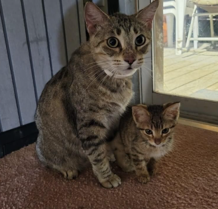 Inside a cozy home with wooden floors and quiet surroundings, two cats found themselves facing each other in what looked like a serious feline conversation. One was an orange-and-white cat sitting upright with confident posture. The other, a gray tabby, appeared slightly cautious as it leaned back near the doorway.