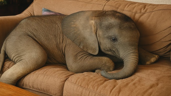 Unlike the powerful and towering adults often associated with elephants, this young one looks incredibly gentle and vulnerable. Its small gray body is curled up comfortably on the soft cushion, its legs tucked under like a child settling in for a deep nap.