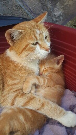 The mother cat, a gentle orange tabby, sits calmly with her body slightly curled around the little one. Her kitten is tucked safely against her chest, sleeping peacefully while wrapped in the warmth of its mother’s embrace.