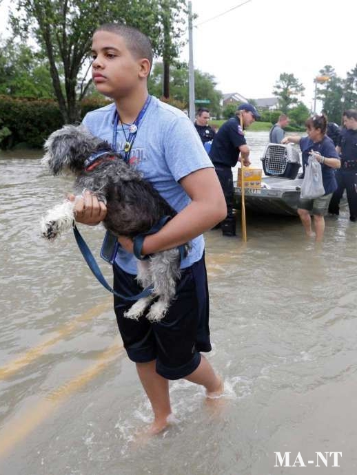 In the middle of a flooded street, one image is standing out for its emotion and simplicity: a young boy carefully carrying his small dog through knee-deep water while rescue efforts continue around him.