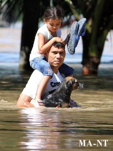 What makes the image so powerful is its raw simplicity. The child sits high above the water, trying to keep dry, while the dog is held close against the man’s chest. Both depend entirely on him. And in that moment, he becomes more than a parent or pet owner — he becomes a lifeline.