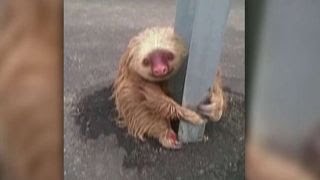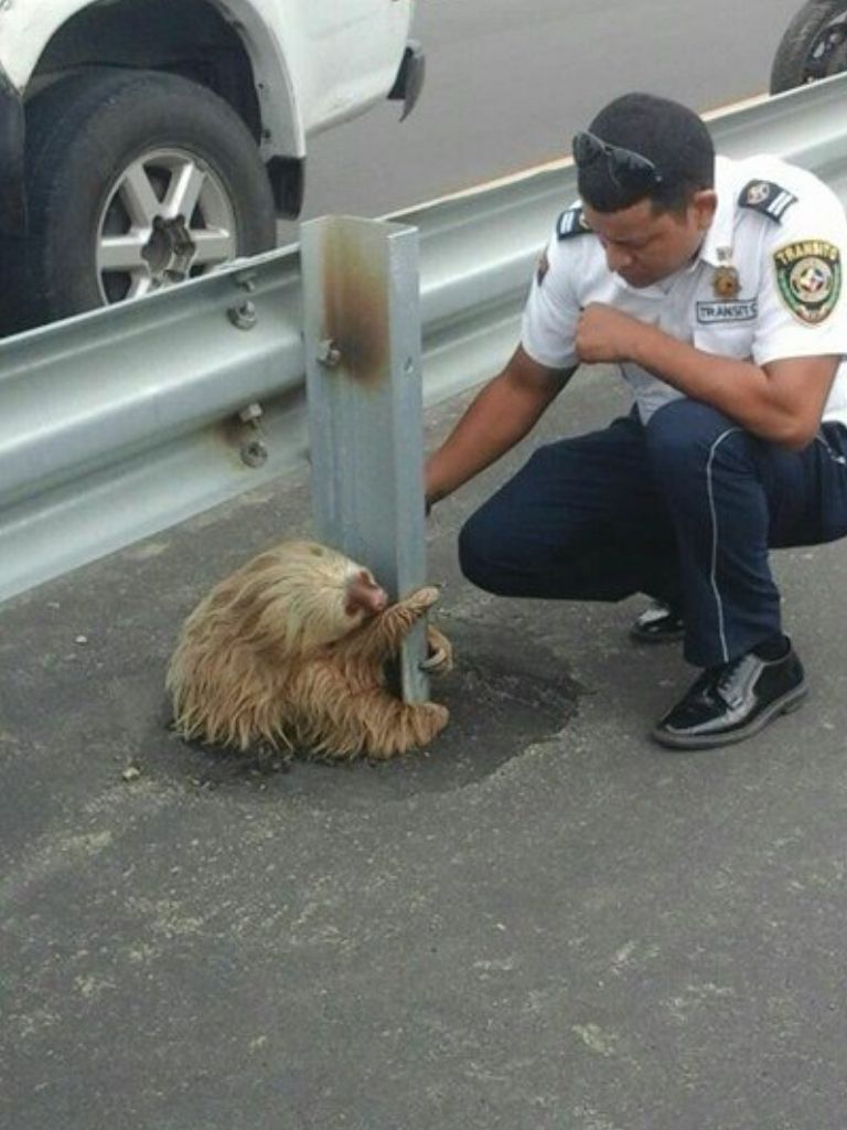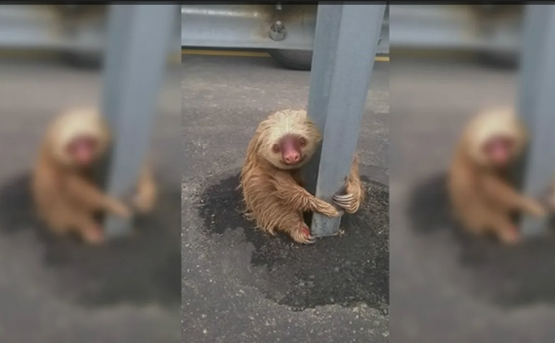 For a sloth, which spends most of its life calmly hanging from tree branches high above the forest floor, the hard steel barrier of a highway guardrail was probably the closest thing to safety it could understand.