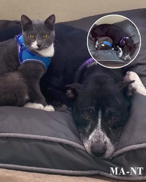 At the center of the photo, a gray-and-white cat wearing a blue harness sits comfortably on top of a black-and-white dog resting on a large cushion bed. The dog lies still, calm and patient, while the cat appears completely at ease, as if this is the most natural seat in the house. Then comes the detail that makes the moment even sweeter: a small inset image showing the same pair curled up together, peacefully resting side by side.